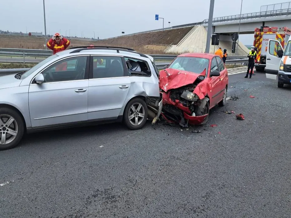Circulația a fost oprită din cauza unui accident. Două mașini s-au lovit după ce una dintre ele a schimbat brusc banda.