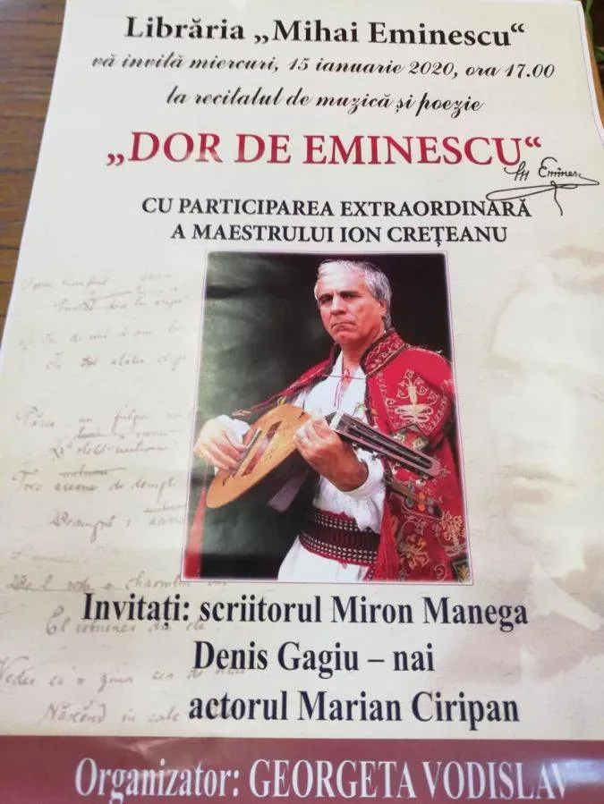 Librăria „Mihai Eminescu”, din Bucureşti, găzduieşte vineri, 15 ianuarie, ora 17.00, recitalul de muzică şi poezie „DOR DE EMINESCU”, cu participarea extraordinară a rapsodului popular Ion Creţeanu.