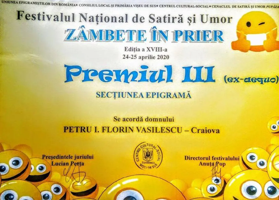 Cunoscutul epigramist craiovean Petre I. Florin Vasilescu (PIF, pentru prieteni) a obţinut, la Festivalul de Satiră și Umor „Zâmbete în Prier” (desfăşurat online) de la Vișeu de Sus, în perioada 24-25 aprilie 2020, Premiul III, la Secţiunea EPIGRAMĂ, acordat de un juriu al cărui preşedinte a fost cunoscutul epigramist, la nivel naţional, Lucian Perţa, directorul festivalului fiind Anuţa Pop.