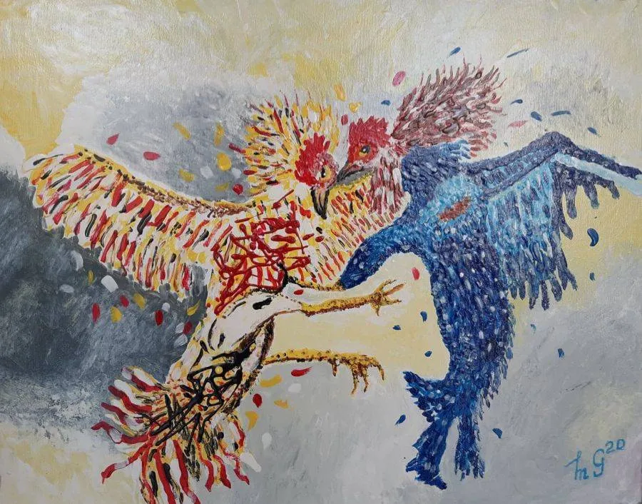 Expoziţia cuprinde tablouri cu cocoşi care pozează, ca la fotograf, cu cocoşi paşnici, dar, mai ales, cu cocoşi care se bat, cum e şi în viaţă: dacă nu eşti şi cocoş, din când în când, rămâi găină, iremediabil.