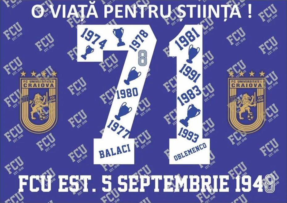 Cea mai iubită echipă din provincie, FC Universitatea Craiova se află la ceas aniversar. 5 septembrie 1948 este ziua pe care fanii Științei nu o vor uita niciodată. Este ziua în care echipa noastră dragă a fost înființată. În 71 de ani de istorie Universitatea Craiova a trecut de la agonie la extaz, dar și invers. Însă un lucru este clar. Indiferent de situație nimeni nu ne poate schimba istoria, mai ales după măcelul la care clubul alb-albștrilor, cu patru campionate câștigate, dar și cu șase cupe ale României adjudecate, plus o semifinală de Cupa UEFA, a fost supus în 2011. Nu uităm nici umilința la care Universitatea Craiova a fost supusă în 2014, atunci când cu complicitatea autorităților locale de la vremea respectivă, FCU a fost practic pusă la pâmânt.