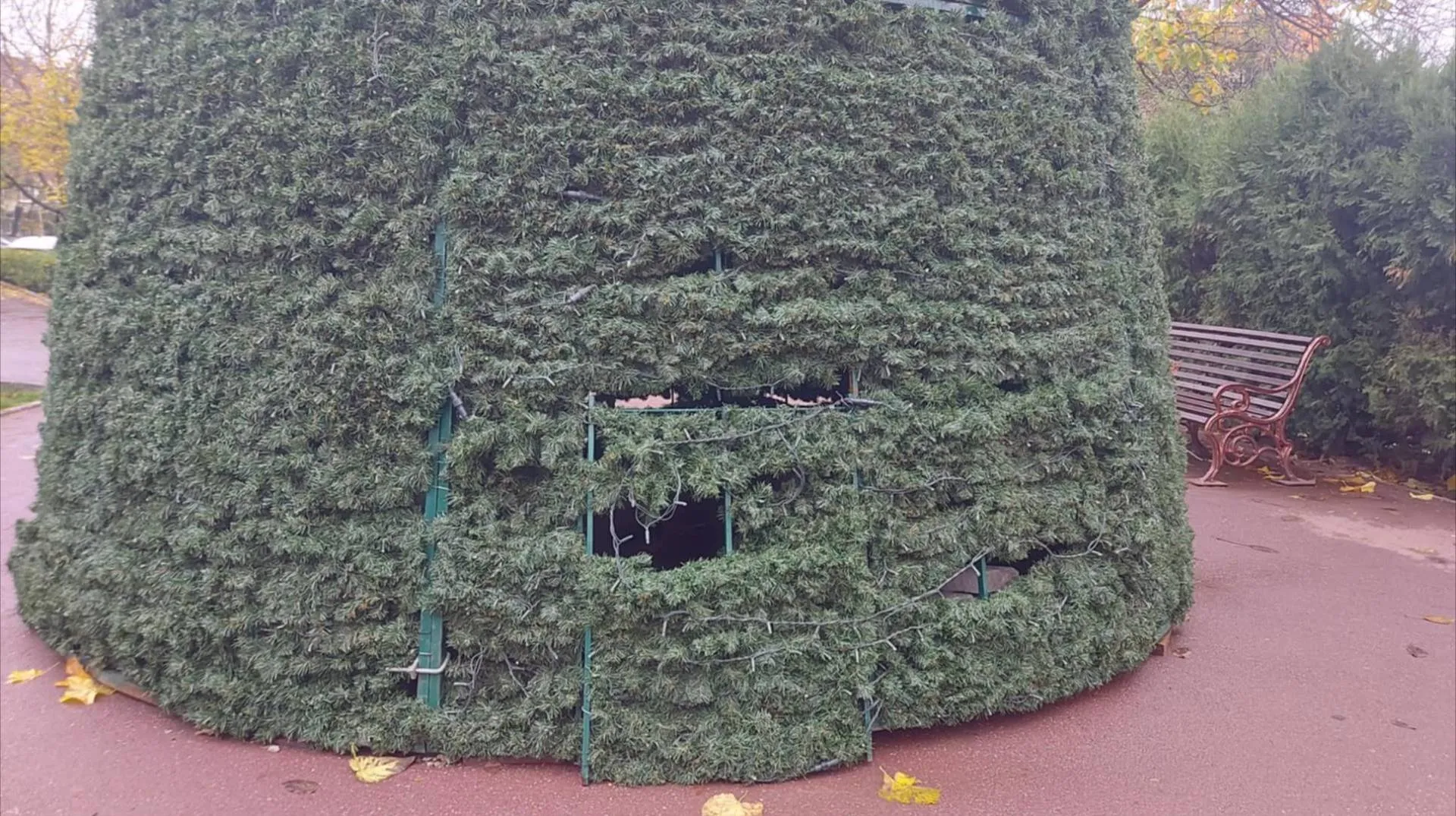 Cu porțiuni deja deteriorate și decorațiuni lipsă, acest brad, vorba unui locuitor din zonă, pare „obosit înainte să se aprindă”. Sau, cum spun eu, este pus acolo ca să fie.